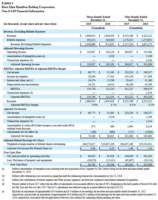 Booz Allen utilizes and discusses in this release Revenue, Excluding Billable Expenses, Adjusted Operating Income, Adjusted EBITDA, Adjusted EBITDA Margin, Adjusted Net Income, and Adjusted Diluted EPS because management uses these measures for business planning purposes, including managing its business against internal projected results of operations and measuring its performance. Management views Adjusted Operating Income, Adjusted EBITDA, Adjusted EBITDA Margin, Adjusted Net Income, and Adjusted Diluted EPS as measures of the core operating business, which exclude the impact of the items detailed in the supplemental exhibits, as these items are generally not operational in nature. These supplemental performance measures also provide another basis for comparing period to period results by excluding potential differences caused by non-operational and unusual or non-recurring items. Management also utilizes Revenue, Excluding Billable Expenses because it provides management useful information about the company's operating performance by excluding the impact of costs that are not indicative of the level of productivity of its consulting staff headcount and its overall direct labor, which management believes provides useful information to its investors about its core operations. Booz Allen also utilizes and discusses Free Cash Flow in this release because management uses this measure for business planning purposes, measuring the cash generating ability of the operating business and measuring liquidity generally. Booz Allen presents these supplemental measures because it believes that these measures provide investors and securities analysts with important supplemental information with which to evaluate Booz Allen’s performance, long term earnings potential, or liquidity, as applicable, and to enable them to assess Booz Allen’s performance on the same basis as management. These supplemental performance measurements may vary from and may not be comparable to similarly titled measures by other companies in Booz Allen’s industry. Revenue, Excluding Billable Expenses, Adjusted Operating Income, Adjusted EBITDA, Adjusted EBITDA Margin, Adjusted Net Income, Adjusted Diluted EPS, and Free Cash Flow are not recognized measurements under GAAP and when analyzing Booz Allen’s performance or liquidity, as applicable, investors should (i) evaluate each adjustment in our reconciliation of revenue to Revenue, Excluding Billable Expenses, operating income to Adjusted Operating Income, net income to Adjusted EBITDA, Adjusted EBITDA Margin, Adjusted Net Income, and Adjusted Diluted Earnings per Share, and net cash provided by operating activities to Free Cash Flow, and the explanatory footnotes regarding those adjustments, each as defined under GAAP, (ii) use Revenue, Excluding Billable Expenses, Adjusted Operating Income, Adjusted EBITDA, Adjusted EBITDA Margin, Adjusted Net Income, and Adjusted Diluted EPS in addition to, and not as an alternative to revenue, operating income, net income or diluted EPS as a measures of operating results, each as defined under GAAP, and (iii) use Free Cash Flow, in addition to, and not as an alternative to, net cash provided by operating activities as a measure of liquidity, each as defined under GAAP. Exhibit 4 includes a reconciliation of Revenue, Excluding Billable Expenses, Adjusted Operating Income, Adjusted EBITDA, Adjusted EBITDA Margin, Adjusted Net Income, Adjusted Diluted EPS, and Free Cash Flow to the most directly comparable financial measure calculated and presented in accordance with GAAP.